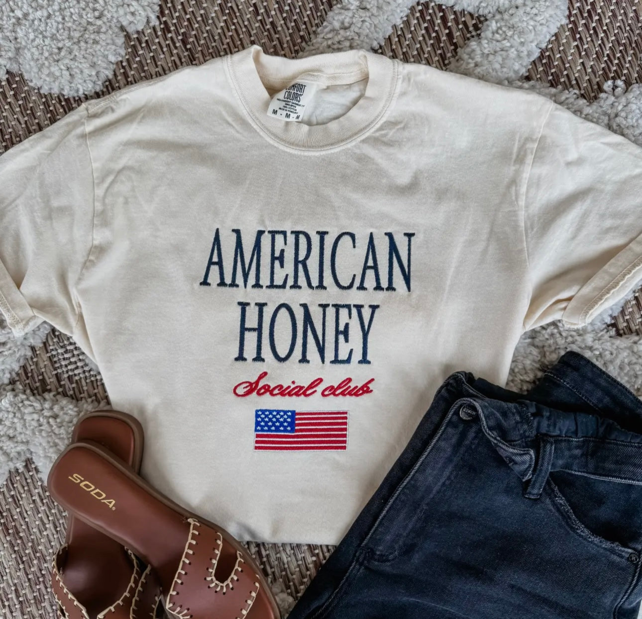 Sweet like honey, bold like the stars and stripes! 🍯🇺🇸 Our American Honey Social Club Tee is your go-to for backyard BBQs, country concerts, or just showing off your USA pride. Featuring a soft cream color, classic crew neckline, and retro-inspired graphic with the American flag — this tee is all about comfy-cute vibes. Pair it with your favorite cutoffs or denim skirt and you’re ready to rock that all-American charm!