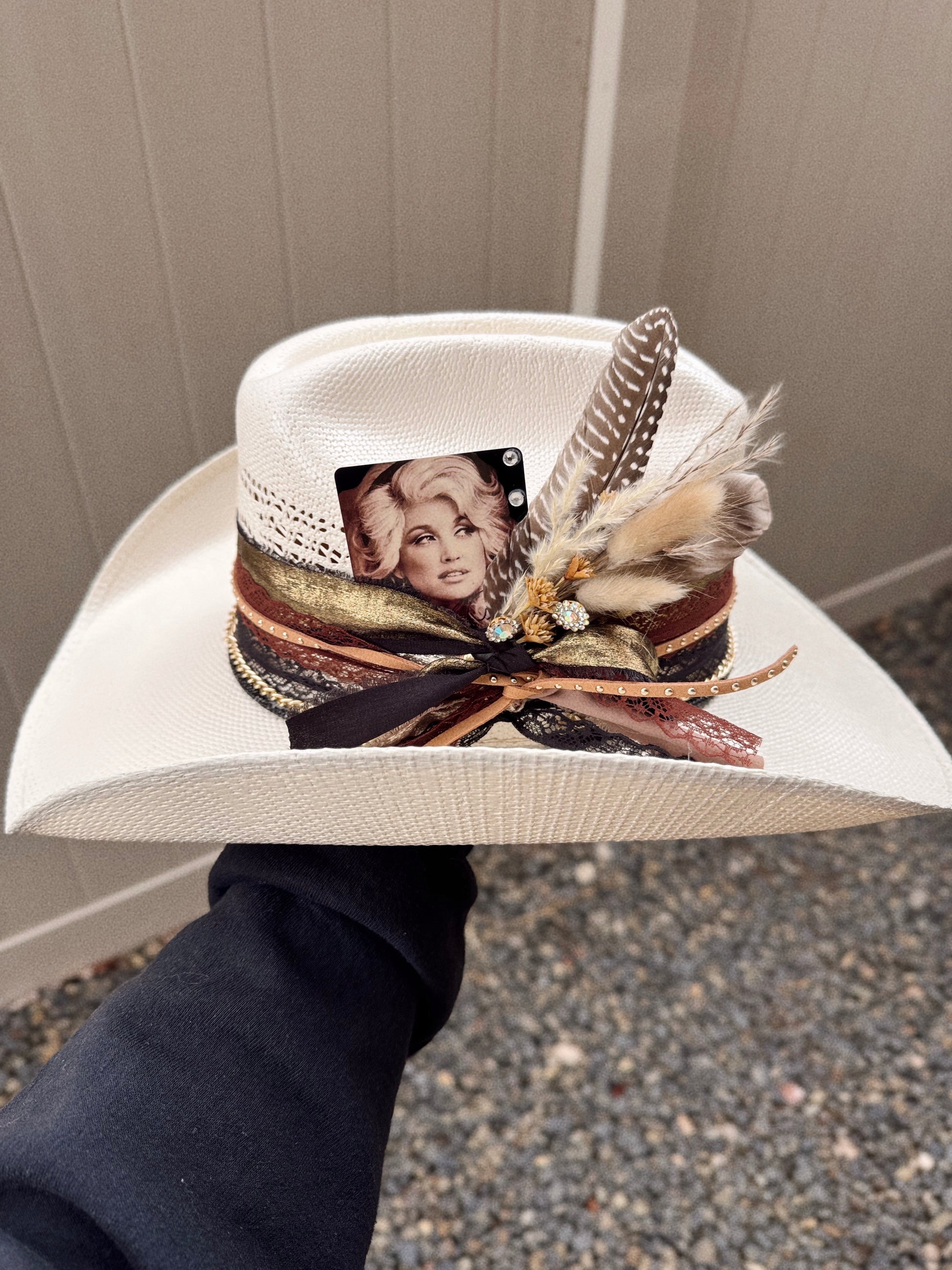Bulletproof Dolly – This show-stopping custom cowgirl hat is where grit meets glam. Crafted by American Hat Makers in an extra large size, it’s designed for the bold-hearted who aren’t afraid to make a statement. A classic ivory base sets the stage for layers of luxe textures — from metallic gold ribbon and rich leather lace to delicate lace trim and soft, natural feathers. Tucked into the band is a vintage-style portrait that tips its hat to the queen of country herself, making this piece a true ode to iconic, untouchable style. Whether you’re chasing sunsets, two-stepping under the stars, or stealing the spotlight at the rodeo, Bulletproof Dolly proves that a little sass and a lot of strength never go out of style.