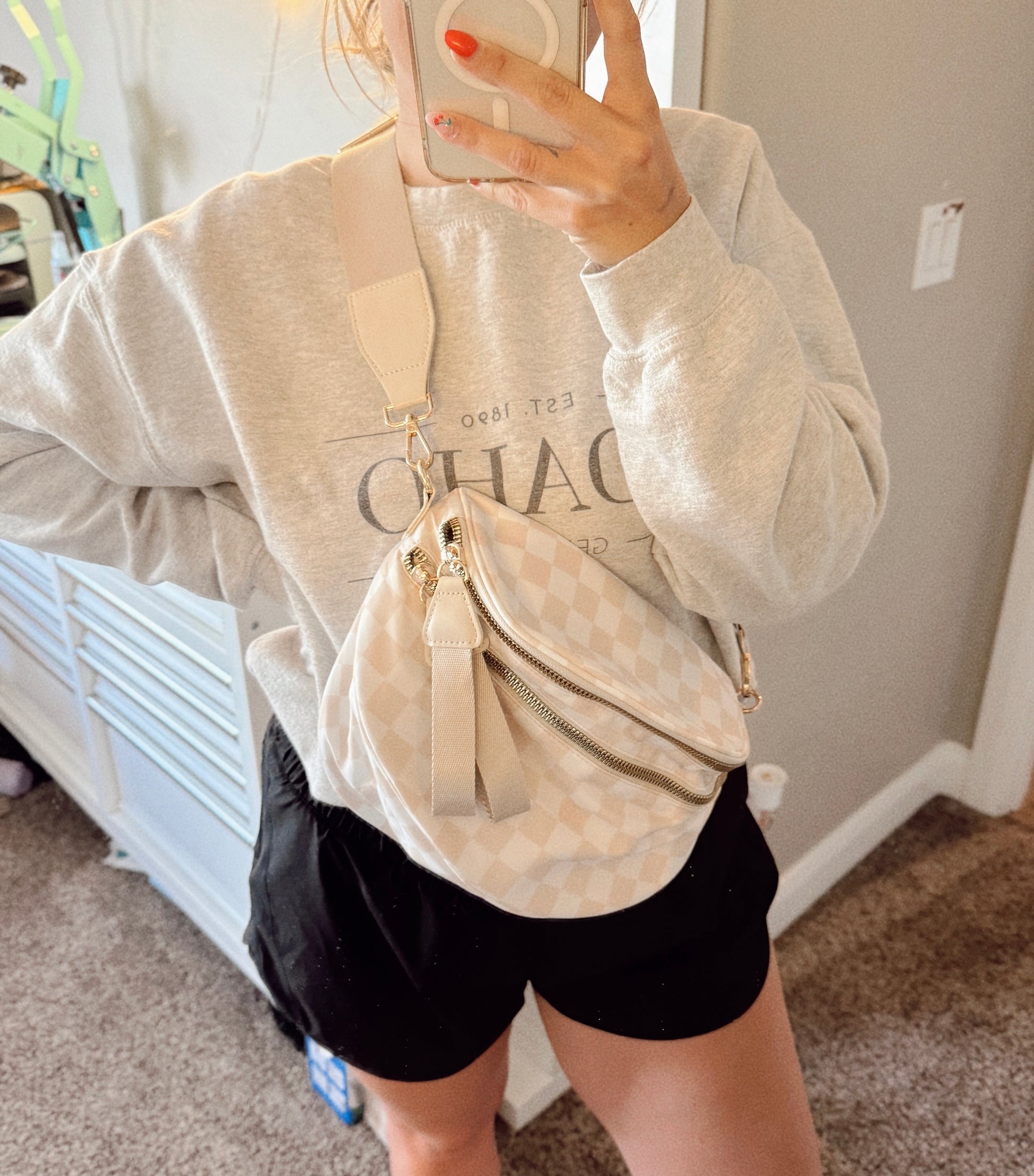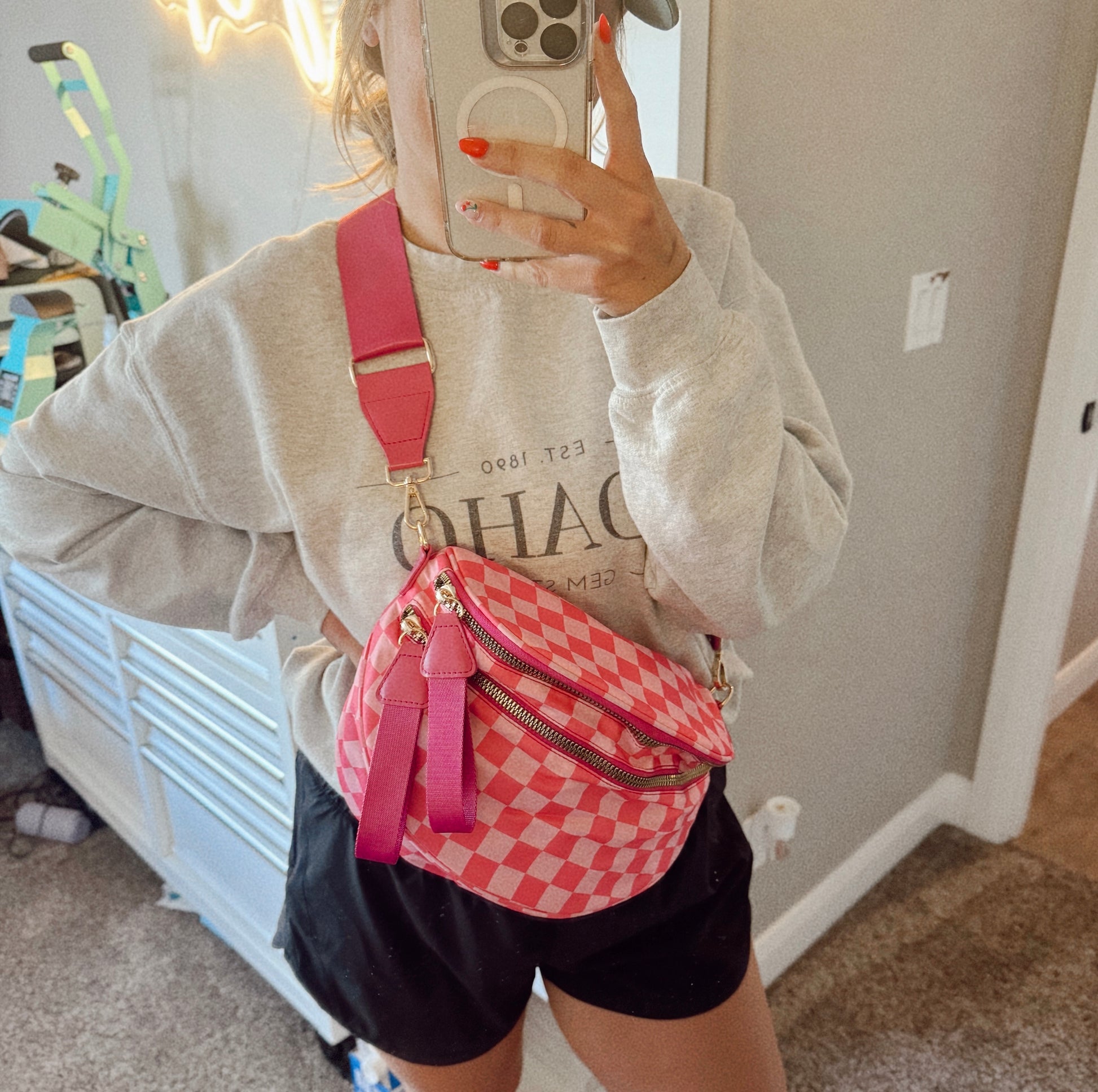 Add a pop of print and a whole lotta attitude with our Checkmate Sling Bag! This bold black and white checkered beauty is the ultimate sidekick for errands, concerts, travel days, and everything in between. Featuring two zip compartments, adjustable wide strap for max comfort, and just enough edge to keep your outfit from feeling basic. Style it across your chest or rock it on the hip — either way, you’re serving looks and keeping it hands-free.