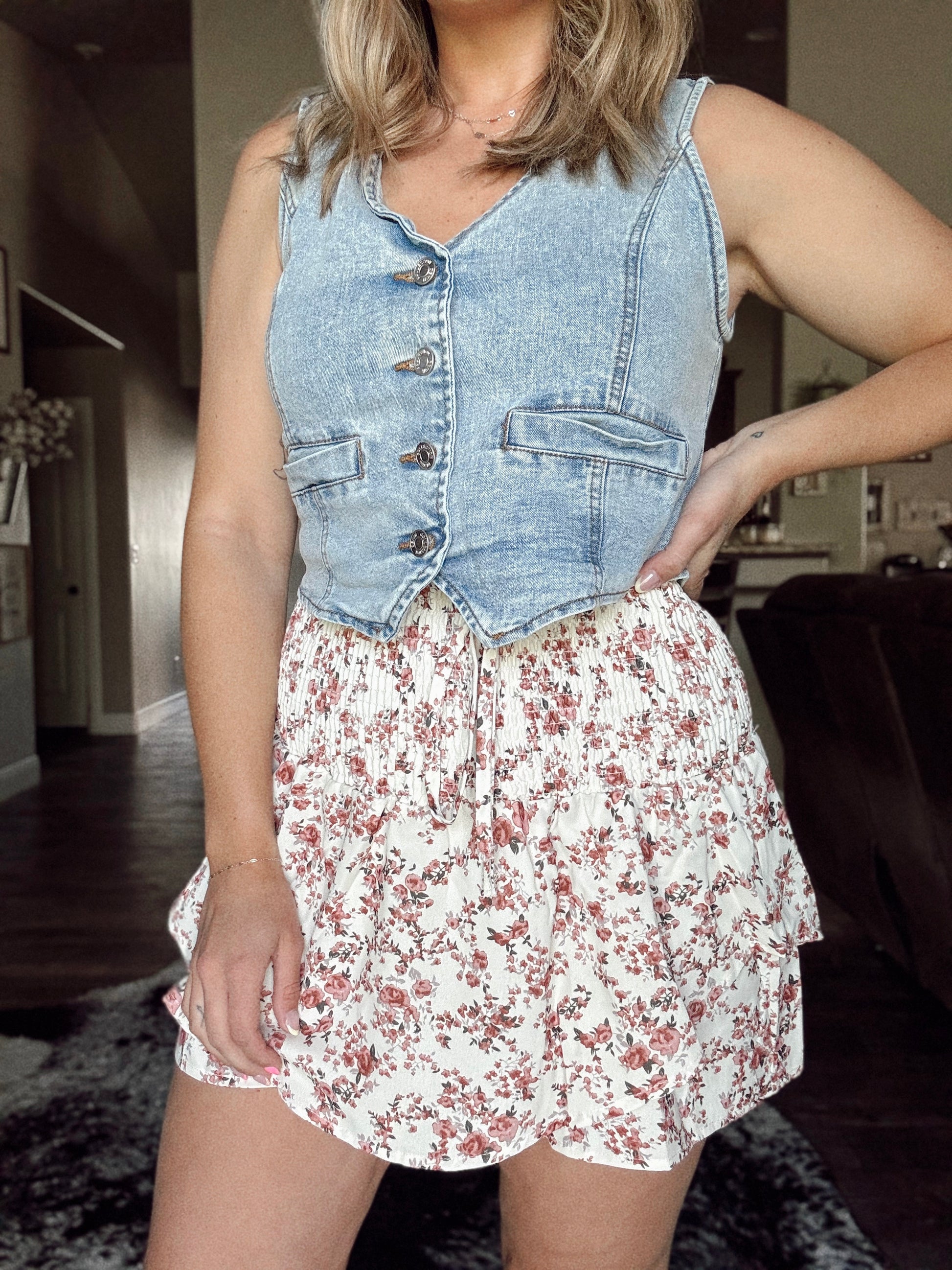 A little flirty, a lot comfy — meet your new favorite skort. Featuring a soft smocked waistband and flowy floral layers, this piece gives you the look of a skirt with the ease of built-in shorts. Perfect for sunny days, country concerts, or just twirling through your weekend plans.