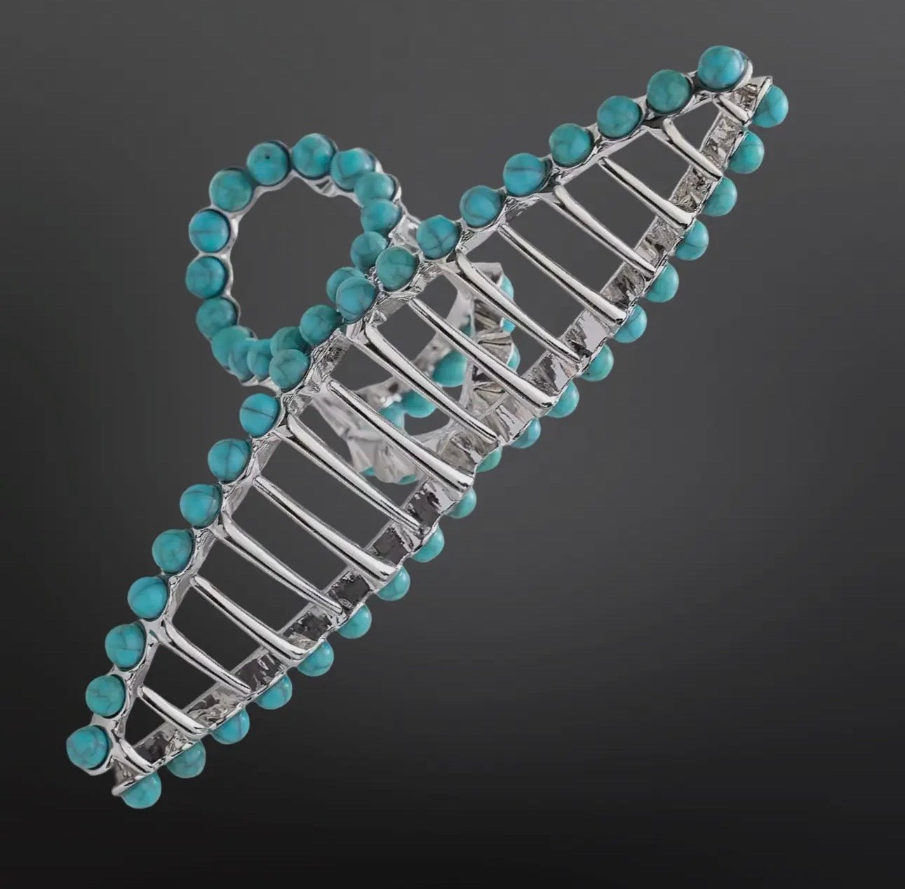 Add a little desert charm to your everyday look with this turquoise-touched beauty. The Faux Turquoise Claw Clip features a stunning western-inspired design with faux turquoise stones and silver-tone detailing that instantly elevates any hairstyle. Whether you’re heading out to a rodeo or just need a quick grab-and-go clip with cowgirl flair, this piece keeps your hair secure while showing off that Western Winks edge.