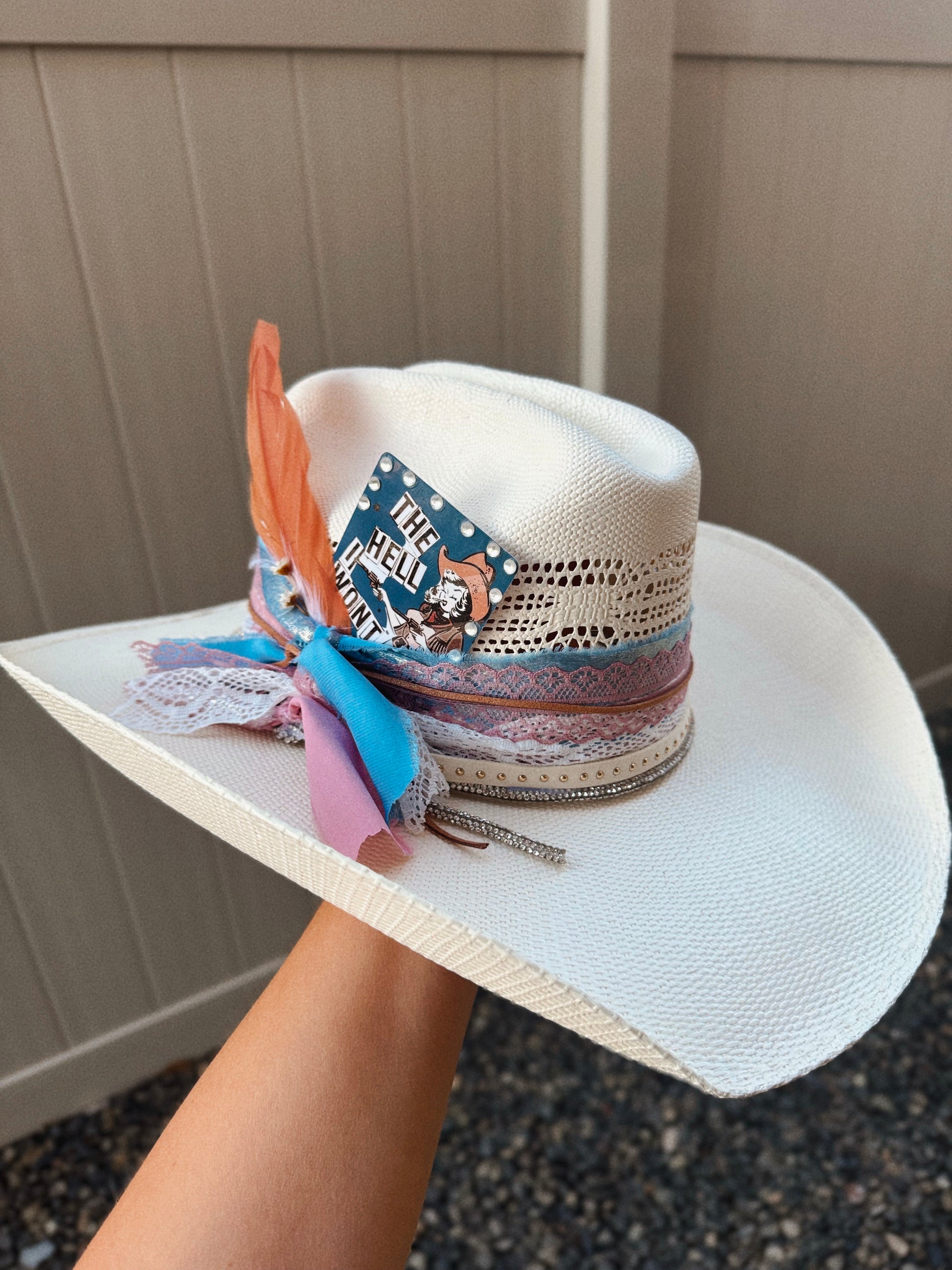 The Hell on Heels is a show-stopping custom design from American Hat Makers, sized in medium. Made with a crisp ivory straw body and a breathable cut-out crown, this hat blends charm with attitude. Wrapped in layered lace and pastel ribbons of pink, lavender, and turquoise, it’s finished with a rhinestone-studded band, playful bow, and a fiery feather for extra edge. Sweet yet daring, this hat was made for the cowgirl who owns every room she walks into and doesn’t apologize for turning heads.