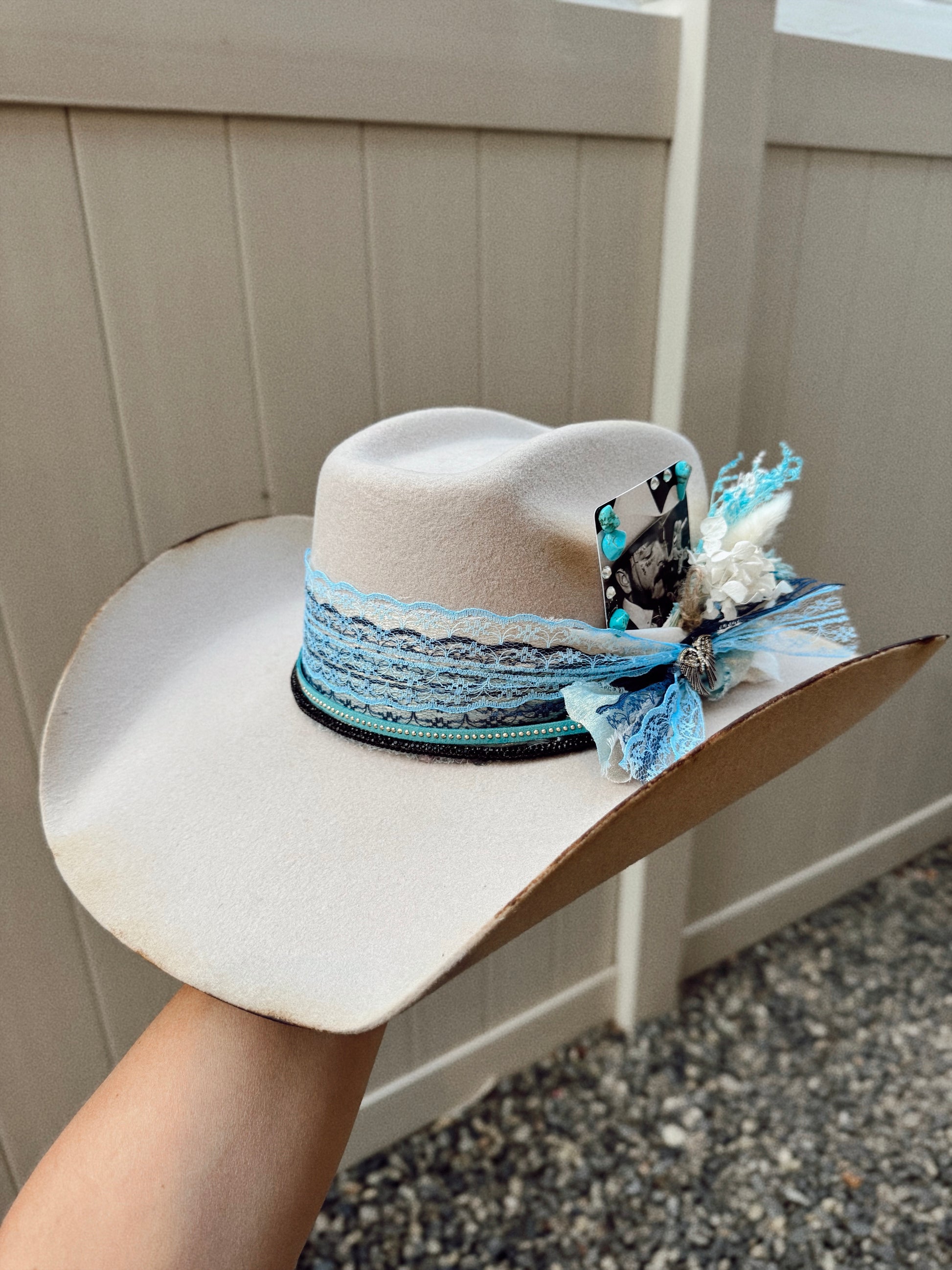 A little lace, a little outlaw 💙🤠 Laced in Malone brings soft Western charm with a dreamy blue lace band, turquoise details, and a bold playing card that screams “cowgirl with a Posty playlist.” 🎶🃏 Finished off with florals and a whole lotta vibe, this hat’s the perfect mix of dusty roads and late-night lyrics 🌙🌾