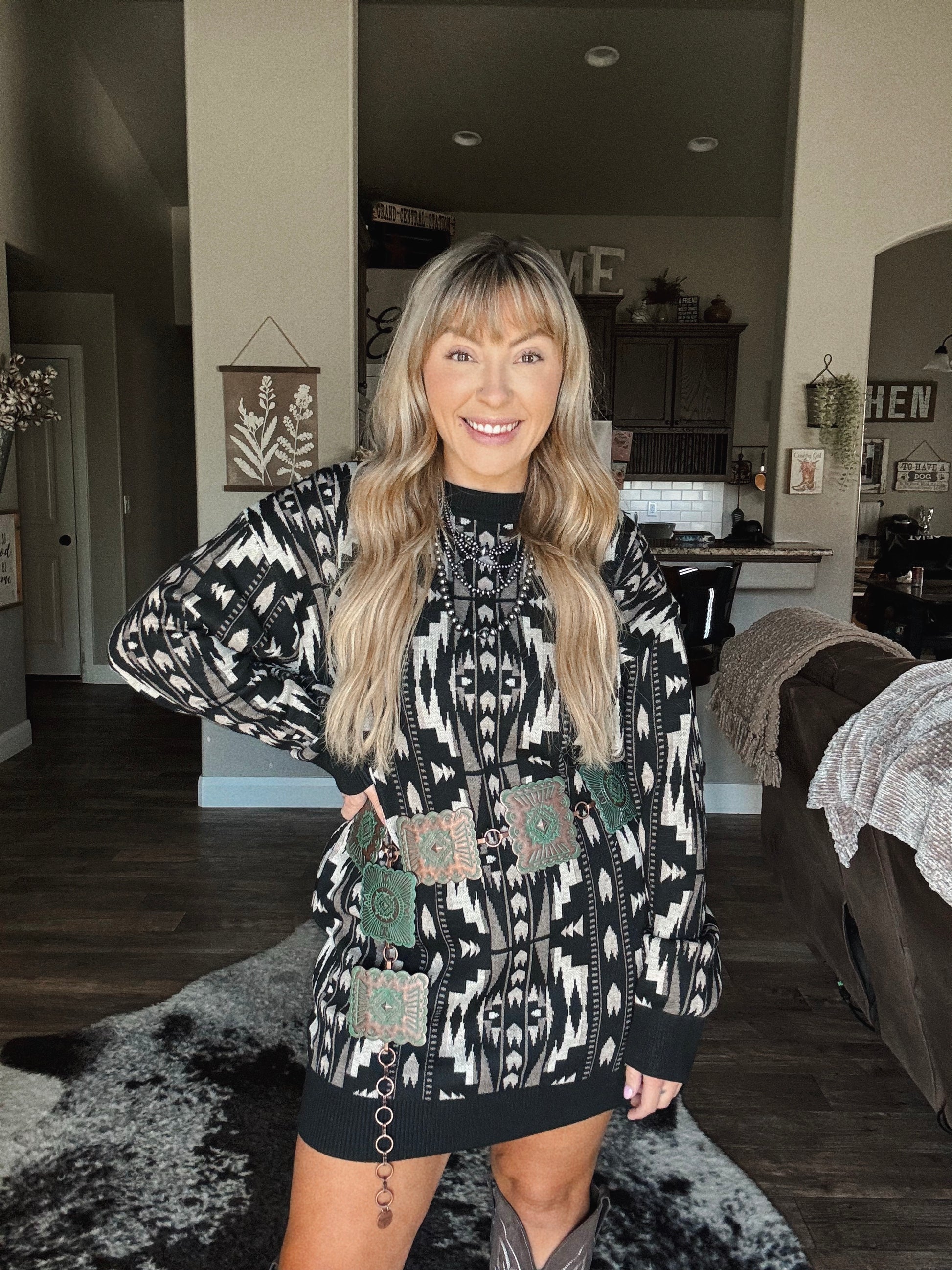 This cozy-meets-chic Montana Aztec Sweater Dress brings bold Western vibes with an effortlessly flattering fit. Featuring a soft knit fabric with a striking black, cream, and taupe Aztec pattern, this dress is perfect for dressing up or keeping it casual. The relaxed, oversized silhouette gives you that comfy sweater feel, while the ribbed cuffs and hem add structure and style.