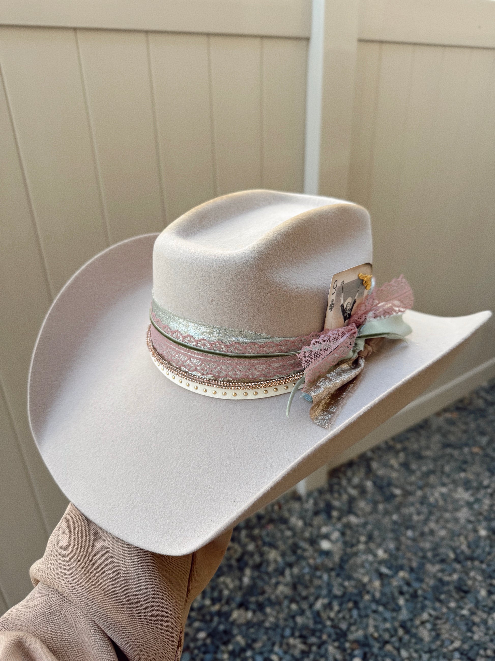 Every cowgirl has her secrets—and this hat holds nine of ‘em. 🖤 The Nine Lives custom cowgirl hat is a bold blend of soft meets dangerous: dusty rose lace 🌹, velvet ribbon, and vintage sage tones wrap around a fierce ivory base 🤍. Tucked into the band sits a worn 9 of clubs ♣️ and a golden pistol charm 🔫—quiet warnings for anyone who underestimates you. She’s graceful. She’s untouchable. And she never plays her last card 🃏.