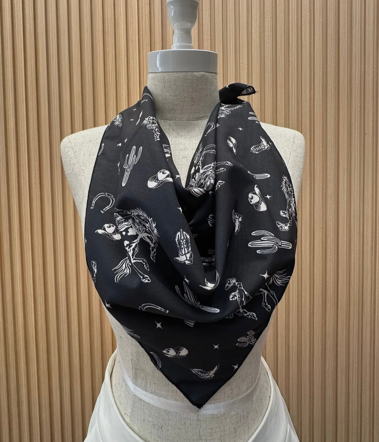 Saddle up, cowgirl—this rodeo-inspired scarf is the perfect wild touch to your western wardrobe. Featuring a bold black base with white sketch-style prints of cowboys, cacti, bucking broncos, and desert moons, it’s giving yeehaw chic in all the right ways. Soft, lightweight, and big enough to style as a neckerchief, hair wrap, or bag accessory—this one’s ready to lasso hearts.