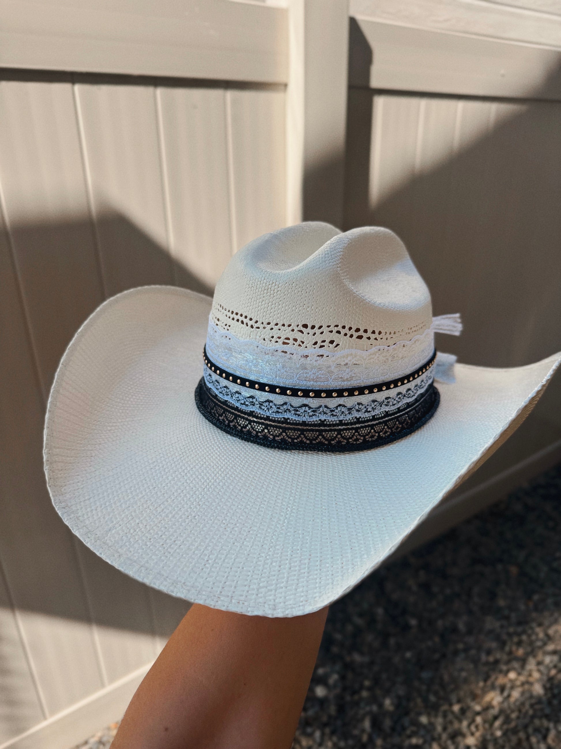 Grace meets grit in this handcrafted showstopper 🤍🖤 This custom cowgirl hat features layered black and white lace, rhinestone-studded ribbon, and a sparkling vintage-style cross brooch that ties it all together. Elegant with a little edge, she’s perfect for Sunday service or Saturday night. Made on a high-quality base from American Hat Makers, this beauty is ready for front row rodeo seats or a little front porch glam.