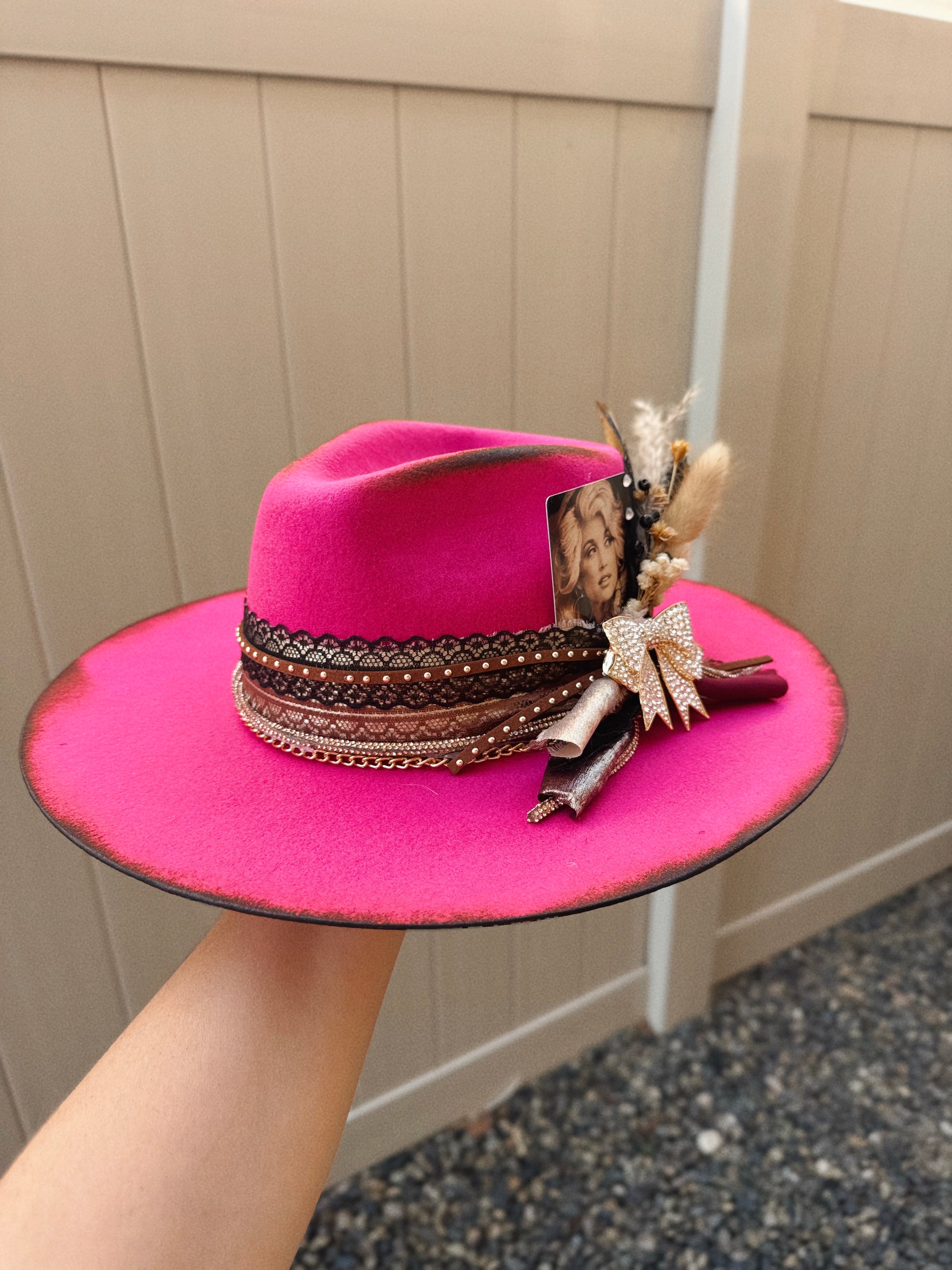 Turn heads and break hearts in The Jolene — a fiery hot-pink custom cowgirl hat that’s as bold as its namesake. Crafted by American Hat Makers in a size Medium (57 CM), this stunner is trimmed with layered lace, leather, and shimmered ribbon. A sparkling bow accent, dried florals, and a touch of Western grit around the brim bring it all together. Finished with a vintage Dolly-inspired detail, it’s the perfect mix of feminine glam and outlaw spirit. Whether you’re two-steppin’ at the honky-tonk or standing out at the rodeo, this hat makes sure nobody steals your spotlight.