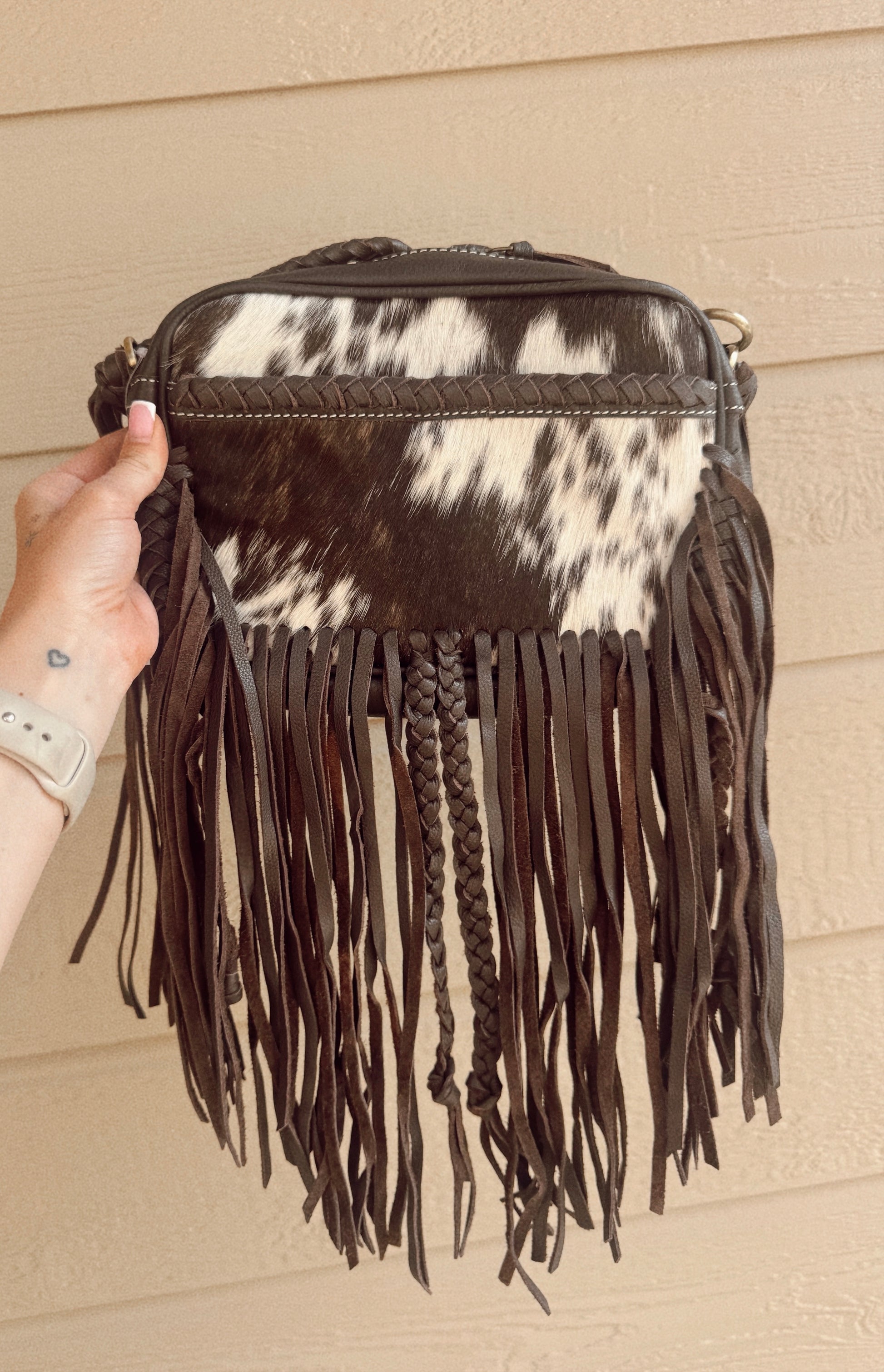 Turn heads and kick up dust with this one-of-a-kind cowhide crossbody! Made with genuine cowhide and buttery-soft leather, this western stunner is accented with hand-braided leather detailing and loads of fringe that dance with every step.