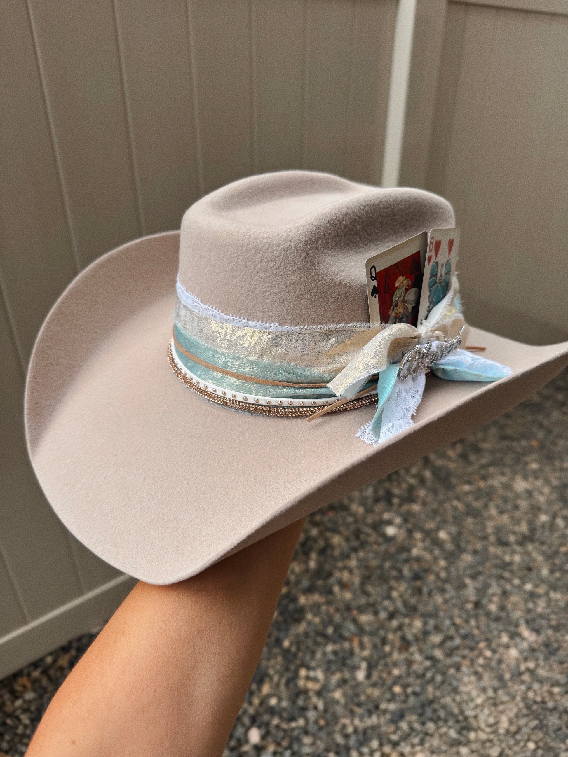 Soft, sweet, and full of charm—Touch of Turquoise is the kind of hat that tells a story. Wrapped in layered lace, shimmering gold, and that signature pop of turquoise ribbon, she’s finished with rhinestones, dainty trims, and a vintage pair of playing cards tucked in just right. Whether you’re headed to the rodeo or just feelin’ a little wild at heart, this size 7 3/4 beauty is your new lucky crown.