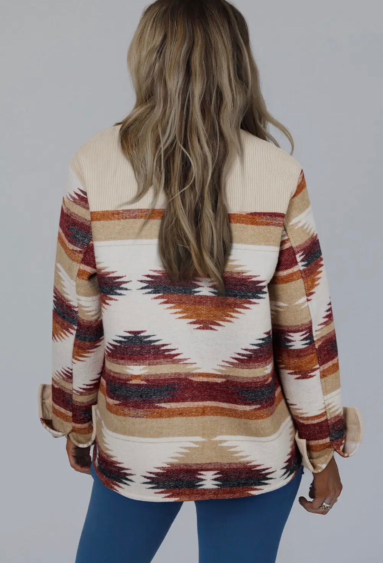 Meet your new go-to layer for chilly days and cozy Western nights. This Western Aztec Striped Patchwork Raheem Shacket blends warm, earthy tones with a bold, Southwest-inspired pattern for a look that’s effortless, rustic, and so on-trend. Designed with soft ribbed corduroy accents along the collar, chest pockets, and button placket, it gives you that perfect mix of texture and style.