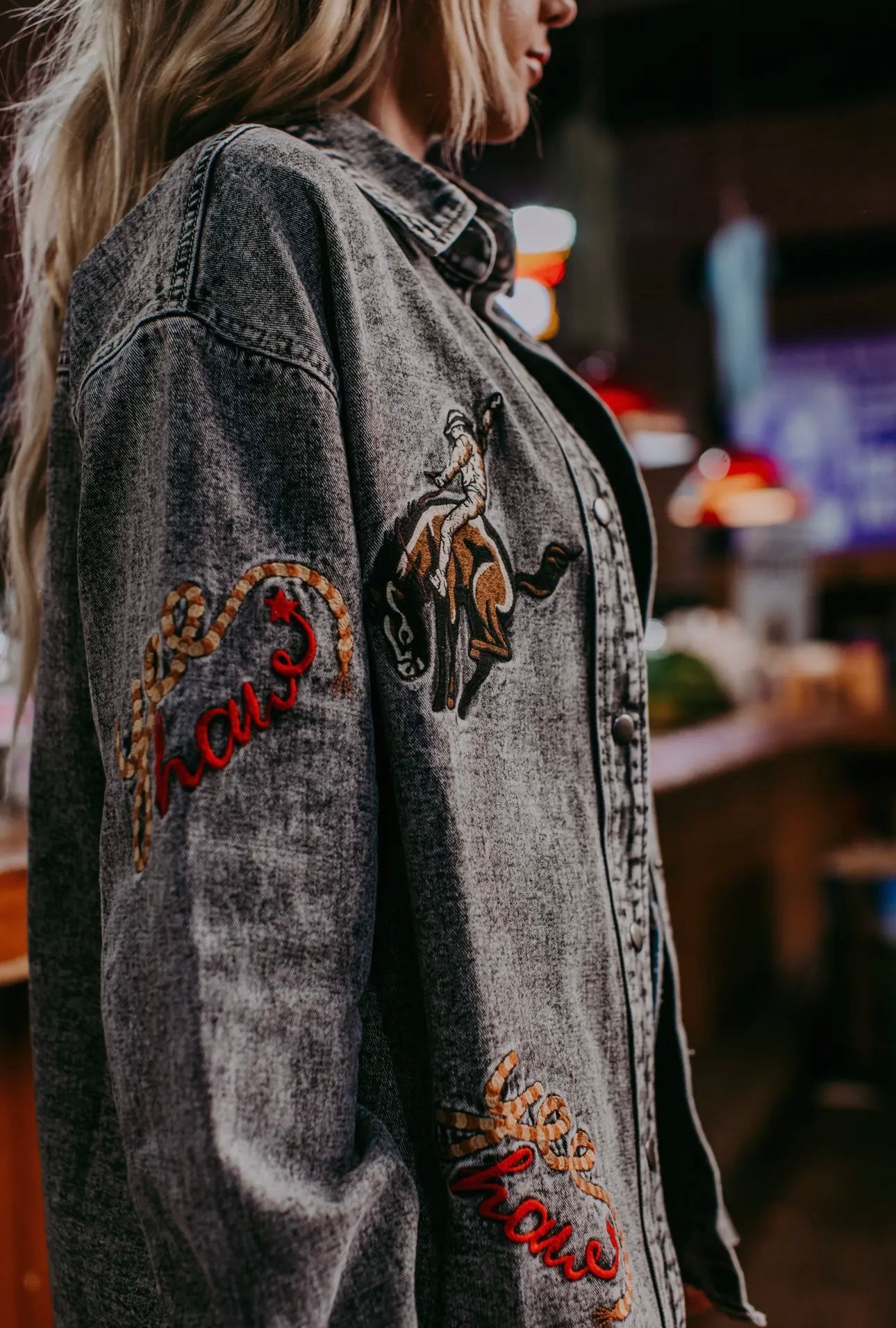 Turn heads and say howdy in style! This acid-washed oversized denim jacket brings bold Western energy with vintage-inspired embroidery and statement patches. Featuring playful pops of color, including the standout “Howdy” on the chest, it’s the perfect layer to throw over your favorite bodysuit or graphic tee. Distressed with just the right edge, it’s equal parts cowgirl cool and comfy casual.
